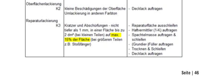 Gemäss Systembeschreibung Audatex ist bei der Reparaturlackierung von Kunststoffteilen ein Fülleranteil bis maximal 15 % der Bauteilfläche im Grundansatz enthalten. Wird diese Fläche überschritten, ist ein zusätzlicher Aufwand auszuweisen und entsprechend zu vergüten. In der Praxis gibt es zwei klar unterscheidbare Ursachen, weshalb dieser Grenzwert überschritten werden kann.